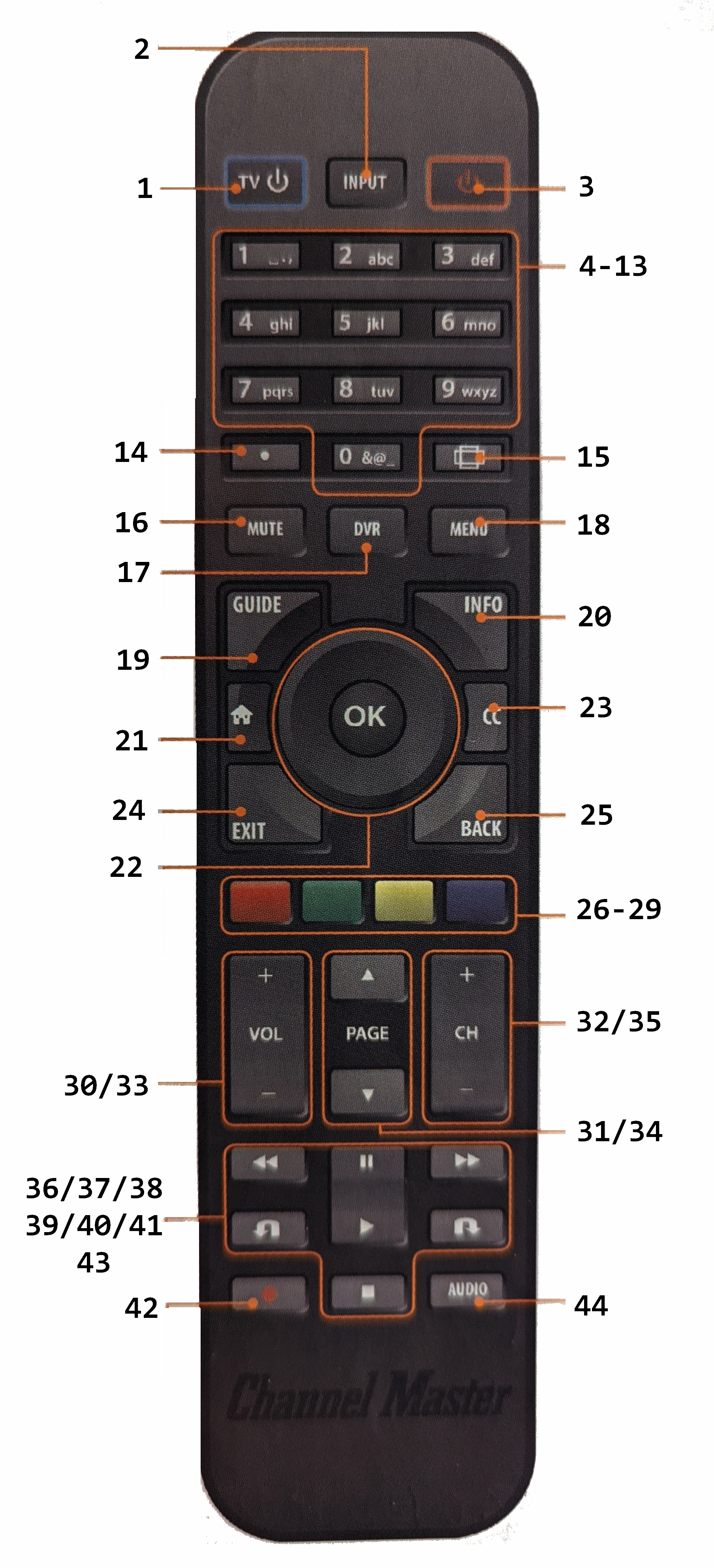 • A—the mode button which switches the remote to the TV Device Mode;